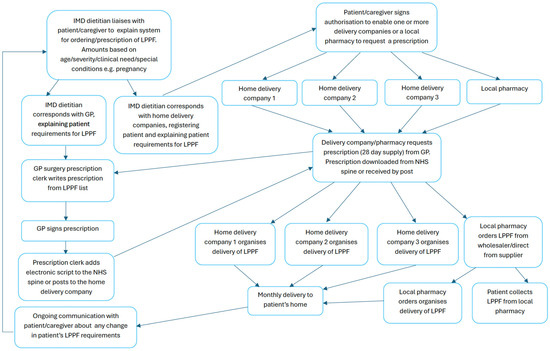 In the UK, LPPF are classified as Foods for Special Medical Purpose (FSMP) and are approved by the government Advisory Committee on Borderline Substances (ACBS) based on clinical need, their efficacy, and price [12]. They are not available in retail shops or pharmacies and are usually obtained via National Health Service (NHS) prescriptions through the General Practitioner (GP). In England, there are 2359 patients with PKU (923 paediatric and 1436 adult patients) who need access to LPPFs [12]. Prescriptions for LPPF are issued monthly and dispensed by specialist home delivery companies or local pharmacists. In Scotland, Wales and Northern Ireland (NI), all prescriptions for all patient age groups are issued free of charge through the NHS and Health and Social Care (NI). In England, prescription products are without cost to children under the age of 16 years or those in fulltime education aged ≤18 years, but most adults (aged ≥19 y to 60 y) are expected to pay a prescription fee for each LPPF item requested unless they are exempt or they have purchased a prescription prepayment certificate at a subsidised rate [13]. In order to control expenditure, guidance on the maximum number of units (1 unit = 1 pack/box as sold) of any particular product to prescribe each month are available through the National Society for PKU (NSPKU) for different age groups [14]. See Figure 1 for flowchart of LPPF ordering and acquisition process.