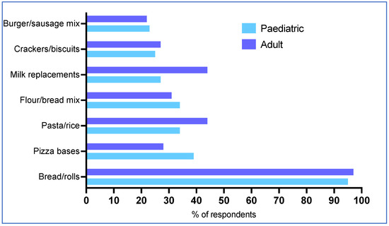 Thirty-one percent (25/80) of respondents reported that up to 25% of their patients had recurring LPPF supply problems and 33% (26/80) said up to 50% of patients had repeated problems. There was no significant difference between paediatric and adult patients. Respondents reported that the most common items in which patients experience supply issues were staple foods, including low-protein bread (96%, 77/80), pizza bases (34%, 27/80), pasta and rice (41%, 33/80), milk replacements (35%, 28/80) and flour or bread mix (33%, 26/80) (Figure 2). This was similar for paediatric and adult patients, where no differences were statistically significant.