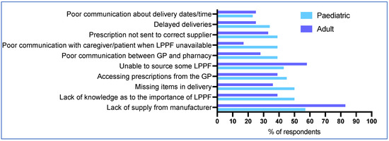 The top five problems reported when pharmacies dispensed LPPFs were a lack of manufacturer supply (69%, 55/80), inability to source some of the LPPFs (50%, 40/80), lack of pharmacist knowledge about LPPF (45% (36/80), missing delivery items (44%, 35/80), and issues accessing the GP prescription (43%, 34/80) (Figure 4). One concern that was more prevalent for adults compared with paediatric patients, was lack of manufacturer supply (83%, 30/36 vs. 57%, 25/44; p = 0.01 Fisher’s exact test) (Figure 4). Conversely, poor communication with caregiver/patient when products were unavailable was more problematic for paediatric than adult patients (39%, 17/44 vs. 17%, 6/36; p = 0.05) (Figure 4).