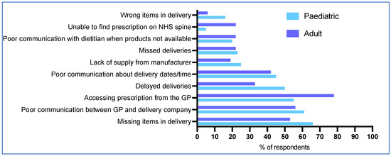 The top five problems reported with home delivery companies for patients accessing LPPF were home delivery company difficulty obtaining the prescription from the GP (65%, 52/80), missing items in the delivery (60%, 48/80), poor communication between the GP and the home delivery company (59%, 47/80), inadequate communication with the patient or caregiver about delivery dates/times (44%, 35/80), and delayed deliveries (43%, 34/80) (Figure 5). Issues were similar for paediatric and adult patients, although adults were more likely than children to experience problems with home delivery companies accessing the prescription from the GP (78%, 28/36 vs. 55%, 24/44; p = 0.04), and locating the prescription on the NHS electronic spine (22%, 8/36 vs. 5%, 2/44; p = 0.04 Fisher’s exact test) (Figure 5).
