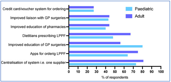 The most commonly reported recommendations by respondents for improving access to LPPF for patients with PKU included centralisation of the system to one supplier (76%, 61/80), and apps for ordering LPPF (69%, 55/80) (Figure 7). Paediatric respondents were more likely to suggest that improved GP surgery education may help (80%, 35/44 vs. 56%, 20/36 for adult dietitians/DSWs, p = 0.03 Fisher’s exact test), and adult dietitians/DSWs were more likely to suggest direct dietetic prescription of LPPFs (67%, 24/36 vs. 48%, 21/44 paediatric dietitians/DSWs; p = 0.11) (Figure 7).