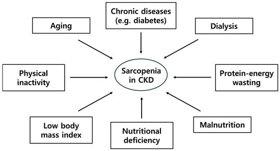 Risk factors for sarcopenia in CKD include aging, chronic diseases such as diabetes, dialysis, PEW, malnutrition, nutritional deficiency, low body mass index, and reduced physical activity [21] (Figure 1). Patients with CKD frequently experience PEW and malnutrition due to dietary restrictions, reduced appetite, and metabolic disturbances [13]. Additionally, patients with CKD may experience difficulties with chewing due to dental issues, and changes in taste perception as aging advances, leading to reduced appetite and dietary intake [22]. In addition, nutritional deficiency of protein, essential amino acids, and vitamins (e.g., vitamin D) can exacerbate muscle loss [14,15].
