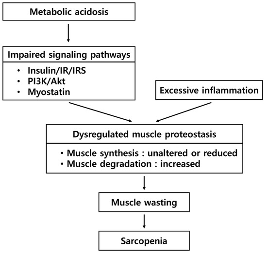 Metabolic acidosis is a condition that accumulates endogenous acids and is diagnosed when bicarbonate levels fall below 22 mEq/L [50]. The prevalence of metabolic acidosis is estimated to be 20% in CKD patients and increases as CKD progresses [50,51]. In an acidotic rodent model, metabolic acidosis increased skeletal muscle breakdown by the activation of ubiquitin-proteasome-dependent pathway [52] and glucocorticoid-mediated action [53]. In addition, metabolic acidosis condition was associated with declines in gait performance and physical function in individuals with and without CKD [54,55]. Metabolic acidosis stimulated protein degradation by interfering with the action of insulin in patients with CKD [56]. Another study on long-term hemodialysis patients altered blood bicarbonate concentrations using bicarbonate supplements and demonstrated that acidosis accelerated muscle breakdown, which was corrected by bicarbonate supplements [57]. The catabolic effects of metabolic acidosis on skeletal muscle are mediated, in part, by impaired insulin signaling involving the insulin/insulin receptor (IR)/IR substrate pathway and phosphatidylinositol 3-kinase/Akt pathway. Subsequently, metabolic acidosis-mediated impairment of insulin signaling activates the ubiquitin-proteasome system and caspase-3, enhancing protein catabolism [58]. Another catabolic factor relating to metabolic acidosis is the myostatin signaling pathway. Myostatin is a protein that inhibits muscle growth, and it is often elevated in CKD patients [59]. In addition to metabolic acidosis, excessive inflammation and oxidative stress also increase myostatin synthesis [59].