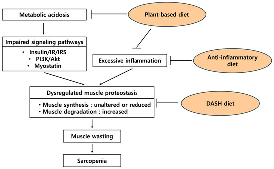 Nutritional interventions for sarcopenia include adequate intake of energy, protein, amino acids (e.g., leucine), vitamin D, and omega-3 polyunsaturated fatty acids (PUFAs) in the general population [14,15]. Application of these interventions for CKD requires caution, considering the needs and restrictions associated with CKD. Moreover, given that PEW and sarcopenia result from overall malnutrition rather than deficiency of specific nutrients, dietary patterns as a practical nutritional strategy for these conditions need to be considered for the management of CKD. Although accumulating evidence is limited, an anti-inflammatory diet, Dietary Approaches to Stop Hypertension (DASH) diet, and a plant-based diet have been suggested as potential dietary interventions to prevent or improve PEW and sarcopenia in kidney diseases [16,17,18]. Mechanisms of developing sarcopenia include inflammation, oxidative stress, defects in muscle protein homeostasis [19,20], and the modulation of these mechanisms may be potential ways underlying how specific dietary patterns attenuate muscle wasting and dysfunction in CKD.