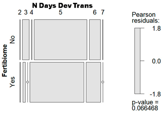 The mosaic chart of the distribution of the number of days from thawing to transfer, considering a multilevel factor, within both evaluated periods.