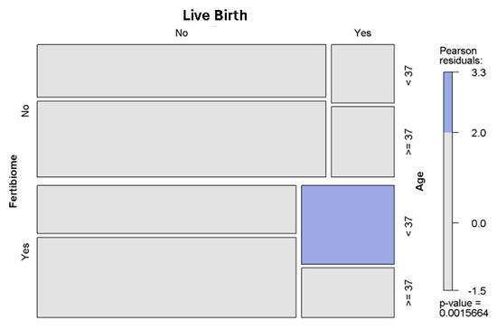 In Figure 2, the number of live births according to age is represented in a mosaic plot, which includes the Pearson residuals distribution and the signification of the log regression model. It shows a higher live birth rate in women under 37-years-old when L. salivarius PS11610 is used (p = 0.0016).