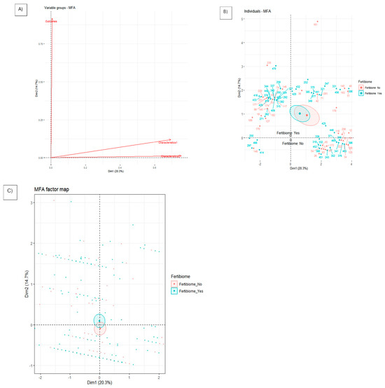 Data distribution was assessed using the Shapiro test, histograms, skewness, and kurtosis. Quantitative variables under normal distribution were summarized as mean ± standard deviation (SD), and comparisons between the two evaluated periods were assessed using a t-test. When data were not normally distributed, median and interquartile range (IQR) and the Kruskal–Wallis test were used. Qualitative variables were summarized using absolute and relative frequencies, and contingency tables were evaluated using the Chi-square test. Finally, multiple factor analysis (MFA) was used to summarize and visualize the relationship between characteristics and outcomes (quantitative and/or qualitative), considering the use of Fertibiome® as the stratification factor. Results were considered statistically significant when a p-value equal to or below 0.05 was obtained. All the analyses were performed in RStudio 2022.12.0 + 353 “Elsbeth Geranium” Release (7d165dcfc1b6d300eb247738db2c7076234f6ef0, 3 December 2022) for Windows using R version 3.6.0 (26 April 2019)—“Planting of a Tree” Copyright (C) 2019 The R Foundation for Statistical Computing.