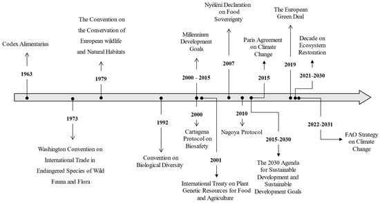 A range of international treaties and agreements have been established to address the urgent need for more sustainable food systems (Figure 1). These initiatives respond to the growing global demand for sustainable agricultural practices, the conservation of biodiversity, and the mitigation of climate change impacts on food security.