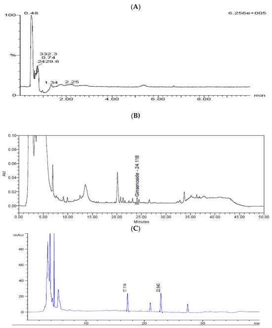 Chromatograms of KFB. (A) LC-MS chromatogram of N-acetylneuraminic acid. (B) HPLC chromatogram of ginsenoside Rg3. (C) HPLC chromatogram of calycosin-7-O-β-d-glucoside and calycosin.