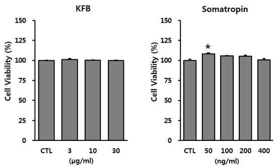 To evaluate the potential toxicity of the test materials, GT1-7 cells were treated with the indicated concentrations of KFB (3, 10, or 30 µg/mL) and somatropin (50, 100, 200, or 400 ng/mL). As shown in Figure 3, KFB did not exhibit cytotoxicity up to 30 µg/mL, whereas somatropin, used as a positive control, presented no toxic effect within the range 50–400 ng/mL. These non-toxic doses were used in subsequent in vitro experiments.