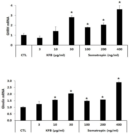 The expression of GHRH and ghrelin mRNA was significantly increased in KFB- and somatropin-treated GT1-7 cells in a concentration-dependent manner relative to that in the control. The GHRH mRNA level showed a 2.8-fold increase at 30 µg/mL of KFB compared to that of the control, whereas the expression of somatropin mRNA exhibited the highest value (3.6-fold that of the control) at 400 ng/mL somatropin among the three groups (control, KFB, and somatropin). Similarly, in comparison to the control, ghrelin mRNA expression was upregulated in the two groups, exhibiting an increase that correlated with the treatment concentration (Figure 4).