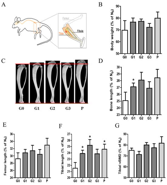 The effect of KFB on body weight and bone growth. (A) The bone schematic diagram, (B) the body weight ratio, (C) a 3D image showing tibial length, (D) the bone length ratio, (E) the femur length ratio, (F) the tibial length ratio, and (G) the tibial vBMD. G0, non-treated group; G1, 304 mg/kg KFB in milk; G2, 2940 mg/kg KFB in milk; G3, 304 mg/kg KFB in saline; and P, 0.2 mg/kg rhGH. * p < 0.05 vs. G0 using RM-ANOVA and ANCONA (n = 7). D0 is a time point before sample administration. vBMD, volumetric bone mineral density.