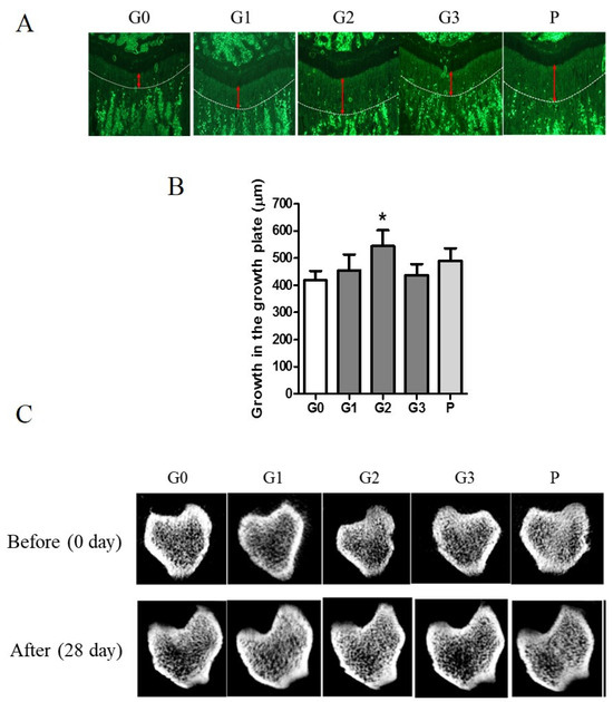 The effect of KFB on the growth plate and microstructure of the cortical and trabecular bones. (A) The fluorescent image of the growth plate. Red arrows indicate the length of the growth plate. (B) The numerical values of the growth plate. (C) The microstructure of the cortical and trabecular bones. G0, non-treated group; G1, 304 mg/kg KFB in milk; G2, 2940 mg/kg KFB in milk; G3, 304 mg/kg KFB in saline; and P, 0.2 mg/kg rhGH. * p < 0.05 vs. G0 using RM-ANOVA and ANCONA (n = 7). The length of bone growth is denoted by a double-headed red arrow.