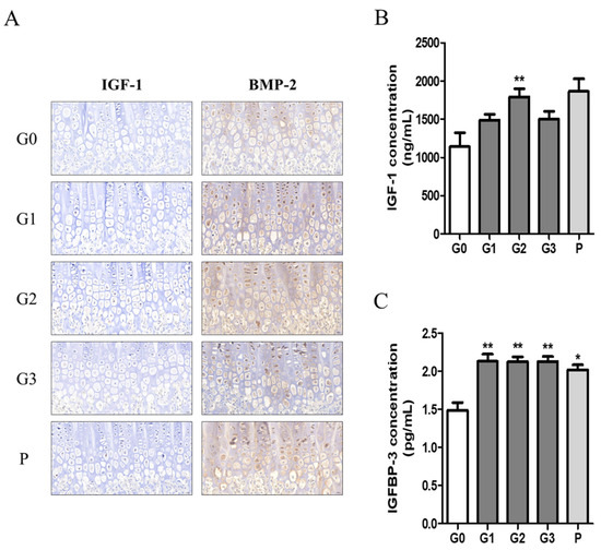 We investigated growth factors such as IGF-1 and BMP2 in bone tissue using immunohistochemistry and quantified the expression levels of IGF-1 and IGFBP-1 in serum using ELISA. The expression levels of IGF-1 and BMP-2 tended to be higher in the hypertrophic zones of the G1, G2, and P groups (Figure 7A). Moreover, serum IGF-1 concentration was significantly higher in the G2 group, with levels comparable to those observed in the P group (Figure 7B). In addition, serum IGFBP-3 levels were significantly elevated in all experimental groups compared with those in the control group (Figure 7C).