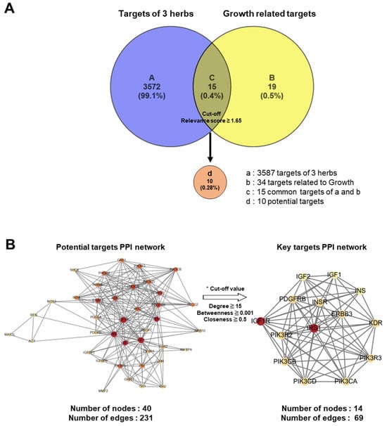 Network pharmacological analysis of KFB. (A) Venn diagram for target genes of 3 herbs (KFB) and growth-related target genes. (B) PPI networks of 40 potential targets (left) and 14 key targets.