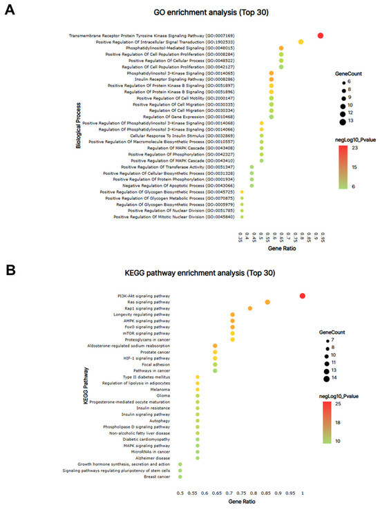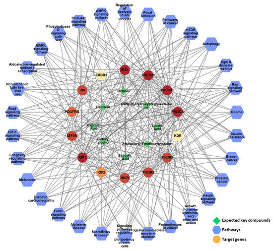 IGF1, insulin-like growth factor I; IGF2, insulin-like growth factor II; ERBB3; receptor tyrosine-protein kinase erbB-3; INSR, insulin receptor; INS, insulin; IRS1, insulin receptor substrate 1; IGF1R, insulin-like growth factor 1 receptor; PIK3CA, phosphatidylinositol 4,5-bisphosphate 3-kinase catalytic subunit alpha isoform; VEGFR2, vascular endothelial growth factor receptor 2; PDGFRB, platelet-derived growth factor receptor beta; PIK3CB, phosphatidylinositol 4,5-bisphosphate 3-kinase catalytic subunit beta isoform; PIK3CD, phosphatidylinositol-4,5-bisphosphate 3-kinase catalytic subunit delta; PIK3R2, phosphatidylinositol 3-kinase regulatory subunit beta; PIK3R3, phosphatidylinositol 3-kinase regulatory subunit gamma.