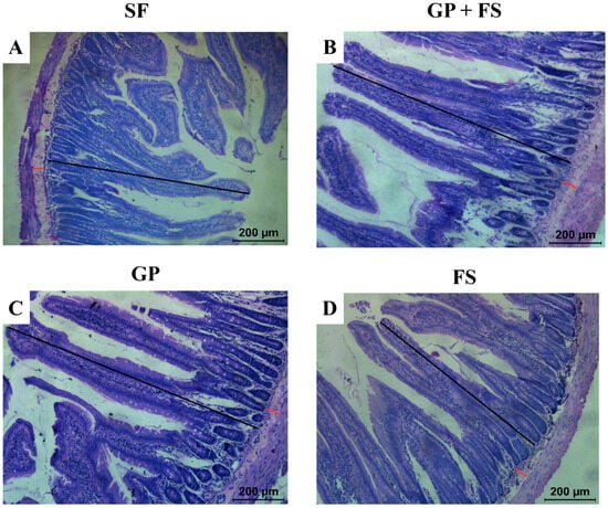 Histological section of the intestinal epithelium (duodenum) for the analysis of the mucosa and submucosa. Cross section of the duodenum of Wistar rats subjected to an analysis of iron bioavailability using the depletion/repletion method. (A) SF: Ferrous Sulfate group; (B) GP + FS: Gryllus assimilis powder associated with soy flour (15:85) group; (C) GP: Gryllus assimilis Powder group; (D) FS: Soy Flour group. The black lines indicate how the measurements of the mucosal thickness were made. The red lines indicate how the measurements of the submucosal thickness were made.