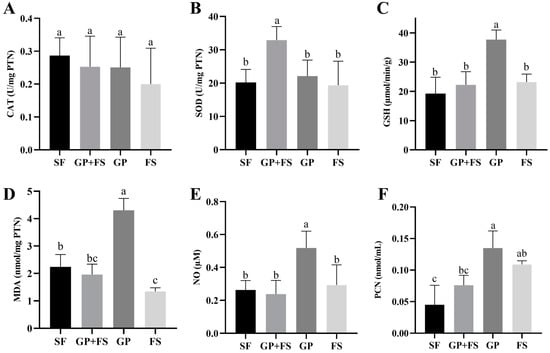 Effect of consumption of Gryllus assimilis powder alone or associated with soy flour on in vivo oxidative balance. SF: Ferrous Sulfate; GP + FS: Gryllus assimilis powder associated with soy flour (15:85); GP: Gryllus assimilis Powder; FS: Soy Flour. (A) Catalase, (B) superoxide dismutase, (C) glutathione S-transferase, (D) malondialdehyde, (E) nitric oxide, and (F) protein carbonylate. Different lowercase letters (a–c) indicate intragroup differences, according to ANOVA tests followed by a Tukey’s test at a 5% probability. Data are expressed as the mean ± standard deviation.