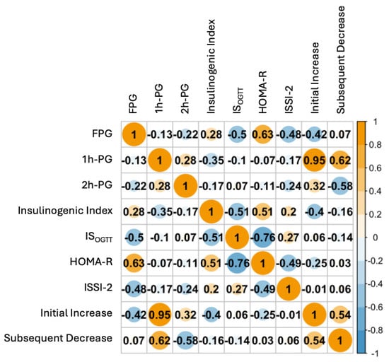 The association between GV and insulin parameters is shown in Figure 1. The initial increase was significantly positively associated with 1 h PG and 2 h PG (p < 0.001); however, FPG, IGI, and HOMA-R were significantly negatively associated with the initial increase (p < 0.001). The subsequent decrease was significantly positively correlated with 1 h PG (p < 0.001) but negatively correlated with 2 h PG (p < 0.001), IGI (p = 0.009), and ISOGTT (p = 0.02). The ISSI-2 was not associated with an initial increase or subsequent decrease.