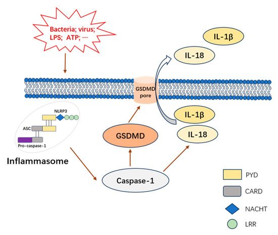 Pyroptosis, inflammatory programmed cell death, has become increasingly popular among scientists for its influence on innate immunity and diseases [10]. The beginning of pyroptosis is caused by the inflammasome, usually formed with the combination of nucleotide-binding oligomerization domain-like receptors (NLRs) synthesized from two parts (a leucine-rich repeat (LRR) and nucleotide-binding oligomerization domain (NACHT)), an adapter apoptosis-associated speck-like protein containing a caspase recruitment domain (CARD) (ASC), and pro-caspase-1, which lead to the activation of inflammatory caspase-1 [10,11]. Gasdermin D (GSDMD) is cleaved as soon as caspase-1 is provoked, following the disruption of membrane integrity by oligomerized N-terminal domain-induced membrane pores [10,12]. The whole process, which includes inflammasome assembly, the activation of caspase-1, GSDMD cleavage and the excretion of IL-1β (Interleukin-1β) and Interleukin-18 (IL-18), is regarded as canonical pyroptotic death [10,13,14,15,16]. NLR pyrin domain-containing (PYD) 3 (NLRP3) is the most common inflammasome sensor leading to canonical pyroptotic death (Figure 1).
