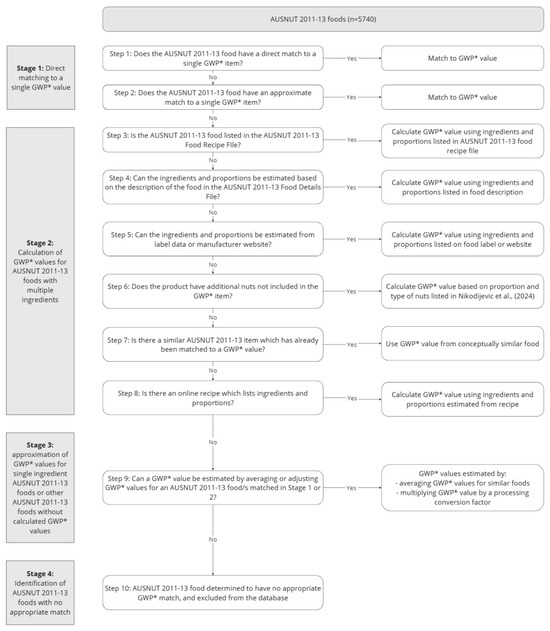 To create the GWP*-AUSNUT 2011-13 database, all n = 5740 food and beverage items in AUSNUT 2011-13 were reviewed, and GWP* values were applied or calculated via a systematic approach—shown in Figure 1 and outlined in further detail below. The process of matching AUSNUT 2011-13 foods to GWP* values involved data from a range of sources, including the AUSNUT 2011-13 food details file (which contains the food name, description, and list of included and excluded items, including brand names) [12], the AUSNUT 2011-13 food recipe file (which contains the ingredients and their proportions for composite foods with multiple ingredients within AUSNUT 2011-13) [13], the AUSNUT 2011-13 food nutrient database (which contains the nutrient data for all AUSNUT 2011-13 foods and beverages) [11], a published database of nut content of AUSNUT 2011-13 foods and beverages [14], as well as label data for commercially available products and online recipes. The climate impact values were limited to the n = 232 GWP* values determined by Ridoutt et al. [7], with the exception of salt. While Ridoutt et al. [7] do not include a GWP* value for salt, due to the ubiquitous nature of salt within the food supply, a value of 0.06 kg CO2e/kg was obtained from CarbonCloud.com [15] and used in the creation of the present database.