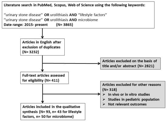 In order to collect the relevant data for the current narrative review, we performed a literature search in three electronic databases (PubMed, Scopus, Web of Science) with the following search term combinations: (for lifestyle factors) = “urinary stone disease” OR urolithiasis AND lifestyle factors, (for microbiome) = “urinary stone disease” OR urolithiasis AND microbiome. Since the publication of data from next-generation sequencing relating to the microbiome and its association with urinary stone disease initiated in 2015, we included articles (original articles and meta-analyses) in the current review that were published from 2015 to the present, were written in English, and reported results only in adults (studies that reported only data from in vitro or in vivo methods, or from pediatric patients, were excluded). For the publications reporting on the effect of lifestyle factors on urolithiasis, we aimed to include reports focusing on the net effect of the above factors on lithogenesis. Therefore, we prioritized the studies that applied multivariate analyses or other methods of adjustment to exclude the effect of confounding factors. The above prioritization was not applicable for microbiome studies because of the very limited number of reports presenting adjusted results. After the exclusion of duplicates and irrelevant reports based on the title and/or abstract, we assessed 411 full-text articles, among which we excluded 318 articles since they were reporting results from laboratory experiments, animal testing, or clinical data from pediatric patients. Notably, several studies were excluded at the full-text assessment stage on the basis of reporting not relevant results for the scope of the current review (not representative of the general population, very small sample, etc.). Finally, we included 93 articles in the qualitative analysis (n = 43 for lifestyle factors, n = 50 for microbiome) (Figure 1).