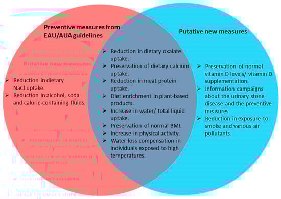 Lifestyle factors include several modifiable elements of the environment/behavior of the population, such as dietary habits, physical activity, body weight balance, patterns of sleep, alcohol intake, and smoking. The above factors are gaining continuously increasing attention due to their association with several pathologic conditions, including various urologic diseases, on the rationale of applying a preventive strategy through their modification [9]. Urolithiasis has also been associated with the effect of specific lifestyle factors in numerous reports, so several urological associations already adopted the respective strategies in their guidelines. Indeed, the European Association of Urology (EAU) recommends several lifestyle modifications in the form of general preventive measures, many of which are supported by a high evidence level [10]. Similarly, the American Urological Association proposes several dietary recommendations with various evidence levels to prevent the recurrence of stone formation [11].