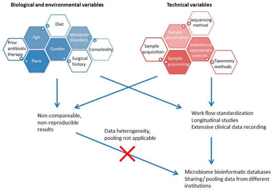 Additionally to the technical variables, several biological/environmental factors have to be recorded and taken into account in the context of performing microbiome research, since they directly affect the microbial populations/functions (Figure 5). These factors include the patient’s characteristics (age, sex, race), and the medical history of the patient (surgeries in the past, metabolic disorders, recent antibiotic therapy) [127]. The registration of the above data is expected to allow the exclusion of confounding effects and the production of objective results, which can be pooled and further analyzed. An essential issue relating to the detection of microbiome perturbations is the putative existence of a core microbiome, which may be used as a reference for comparisons with the analyses of various diseases. To the present, there is no consensus as to whether a core microbiome exists and at which level (different microbial strains, microbial functions, other) it could be defined [128]. Additionally, the core microbiome will possibly include viruses and fungi, which have been investigated only to a very limited extent. Both the technical variables of microbiome analysis and the biological factors that shape the microbiome characteristics inflict substantial challenges in the process of integrating microbiome-based methods in urolithiasis prevention.