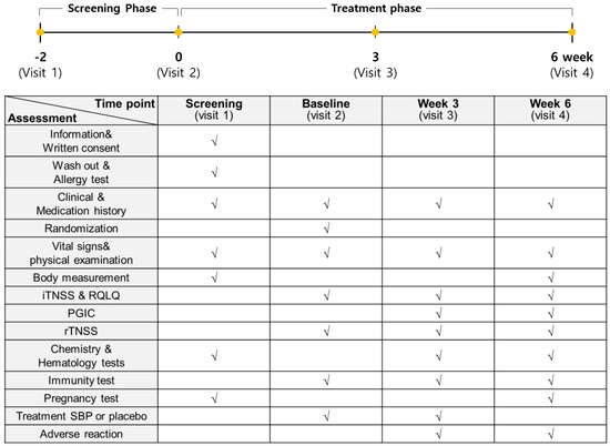 The entire study from participant recruitment to the end of the trial lasted 8 months, from April to December. A total of 76 subjects with allergic rhinitis symptoms between April and November were enrolled in this study to evaluate the anti-allergic effects of SBP. However, based on the inclusion and exclusion criteria, 12 subjects were excluded, and 64 subjects were randomly assigned to the placebo and SBP groups (placebo, 32; SBP, 32). After randomization, the placebo group possessed a higher proportion (63%) of participants recruited between September and November when allergic rhinitis symptoms were the most severe, whereas the SBP group possessed a higher proportion (56%) of participants recruited between June and August when the symptoms tended to be milder. During the clinical trial period, eight participants withdrew for reasons such as withdrawal of consent (1 in SBP group), not following protocol (1 in SBP group, 3 in Placebo group), use of contraindicated drugs (2 in SBP group), and COVID-19 (1 in SBP group), and 56 participants (placebo = 29, SBP = 27) completed the test (Figure 1). Before participating in the clinical trial, the recruited participants or their representatives were provided a thorough explanation of the trial. If they voluntarily agreed to participate, they signed a consent form, and the necessary checks and examinations were conducted at that point. The actual clinical trial, excluding the screening phase, was conducted over 6 weeks. Any tests that were not completed during visit 1 could be performed during a revisit within the screening period. Visit 2 took place within 28 days of visit 1, during which random assignment and prescription of the SBP or placebo were carried out, and the necessary items were examined. Visit 3 occurred 3 weeks after starting SBP or placebo, and visit 4 marked the end of the human application trial that took place 6 weeks after starting SBP or placebo. The examination items corresponding to each time point are presented in Figure 2.