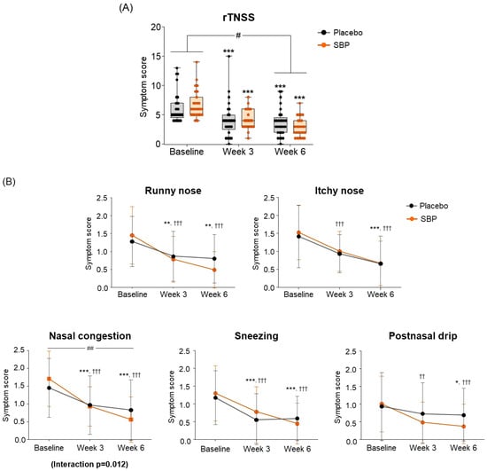 Effect of SBP on reflective total nasal symptoms (rTNSS) and specific symptoms improvement. (A) rTNSS average score and (B) each symptom scores according to placebo or SBP intake. rTNSS survey evaluated symptoms on 4-point scale, where 0 = no symptoms, 1 = mild symptoms, 2 = moderate symptoms, and 3 = most severe symptoms. Values are mean ± SD. Significant difference compared to baseline for the placebo group (* p < 0.05, ** p < 0.01, *** p < 0.001); significant difference compared to baseline for the SBP group (†† p < 0.01, ††† p < 0.001); significant difference between groups from baseline to week 6 (# p < 0.05, ## p < 0.01); Interaction p = interaction between groups and time.