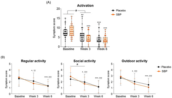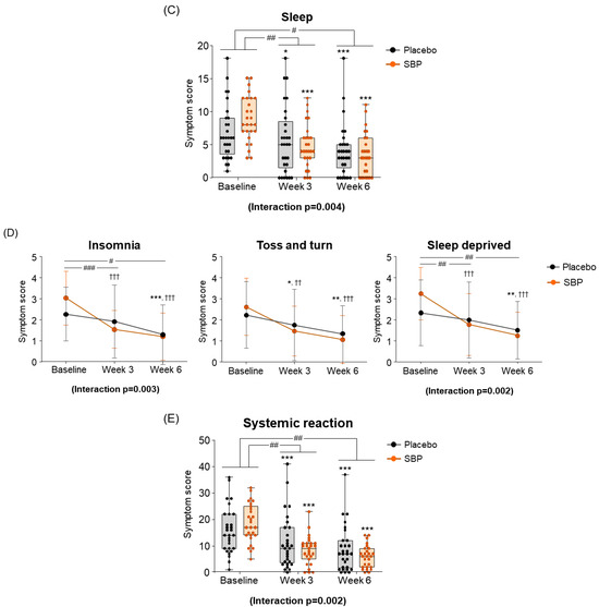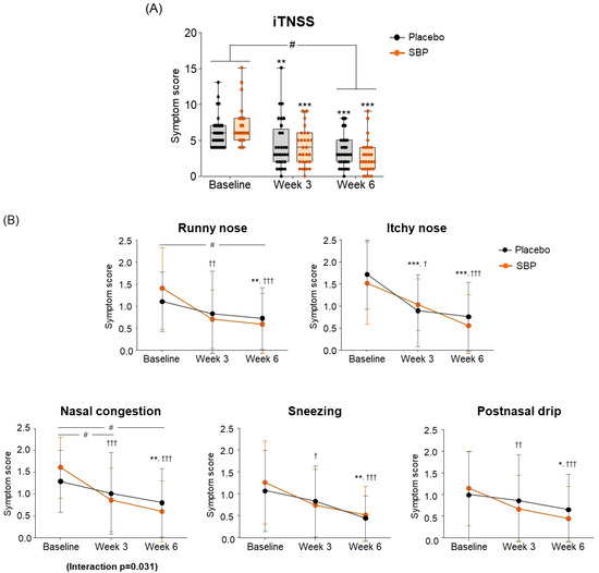 Effect of SBP on instantaneous TNSS (iTNSS) and specific symptoms improvement. (A) iTNSS average score and (B) individual symptom scores according to placebo or SBP intake. iTNSS survey evaluated symptoms on 4-point scale, where 0 = no symptoms, 1 = mild symptoms, 2 = moderate symptoms, and 3 = most severe symptoms. Values are mean ± SD. Significant difference compared to baseline for the placebo group (* p < 0.05, ** p < 0.01, *** p < 0.001); significant difference compared to baseline for SBP group († p < 0.05, †† p < 0.01, ††† p < 0.001); significant difference between groups from baseline to Week 3 or 6 (# p < 0.05); interaction p = interaction between groups and time.