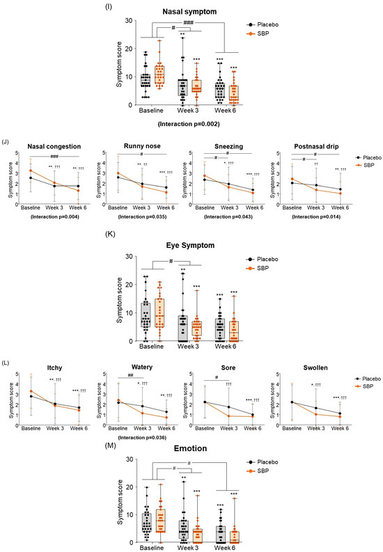 Effect of SBP on activation and specific symptom improvement in the Rhinoconjunctivitis Quality of Life Questionnaire (RQLQ). (A–N) Changes in each symptom of RQLQ scores according to placebo or SBP intake. The RQLQ survey evaluated symptoms on a 7-point scale, where 0 = not troubled, 1 = mildly troubled, 2 = minimally troubled, 3 = moderately troubled, 4 = much troubled, 5 = very troubled, and 6 = extremely troubled. Values are mean ± SD. Significant difference compared to baseline for the placebo group (* p < 0.05, ** p < 0.01, *** p < 0.001); significant difference compared to baseline for the SBP group (†† p < 0.01, ††† p < 0.001); significant difference between groups from baseline to week 3 or 6 (# p < 0.05, ## p < 0.01, ### p < 0.001).