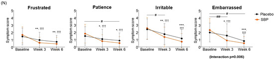 When evaluating the improvement in emotion, the placebo group decreased by 1.97 ± 3.20 points after 3 weeks of intake and by 3.72 ± 3.99 points after 6 weeks compared to the baseline, and the SBP group decreased by 4.70 ± 4.54 points after 3 weeks of intake and by 6.11 ± 3.78 points after 6 weeks. Accordingly, the SBP group exhibited a significant improvement in emotional symptoms after 3 weeks of intake (p = 0.011) and at 6 weeks (p = 0.026). Additionally, repeated measurements indicated a significant difference in the degree of change in emotional symptoms between the groups (p = 0.018), and the SBP group exhibited a significant improvement in emotional symptoms (Figure 5M). Additionally, the SBP group exhibited improvements in emotional symptoms, such as frustration, tiredness, irritation, and embarrassment, with all emotions significantly decreasing from 3 weeks after the start of consumption compared to baseline. In particular, the SBP group exhibited notable improvement in patience and embarrassment. Patience exhibited a decrease of 0.62 ± 1.29 points from 1.52 ± 1.27 points at baseline to 0.90 ± 1.05 points after 6 weeks in the placebo group, while in the SBP group, it exhibited a more substantial decrease of 1.30 ± 1.20 points from 1.85 ± 1.29 points at baseline to 0.56 ± 0.89 points after 6 weeks. This greater reduction in the SBP group indicates a significant improvement in patience-related emotional symptoms after 6 weeks of consumption (p = 0.048). For embarrassment, the changes in symptoms were more pronounced in the SBP group. The placebo group exhibited a decrease of 0.41 ± 0.95 points after 3 weeks and of 1.14 ± 0.99 points after 6 weeks, while the SBP group exhibited a decrease of 1.41 ± 1.53 points after 3 weeks and of 1.78 ± 1.25 points after 6 weeks. This greater reduction in the SBP group revealed a significant improvement in embarrassment symptoms (p = 0.005 at 3 weeks and p = 0.038 at 6 weeks). Furthermore, the repeated-measures analysis confirmed significant differences between the groups, with the SBP group exhibiting a significant improvement in emotional symptoms related to embarrassment (interaction p = 0.006). This confirmed the effect of the test substance on reducing feelings of embarrassment (Figure 5N).