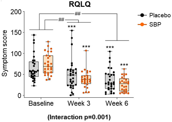 Effect of SBP Rhinoconjunctivitis Quality of Life Questionnaire (RQLQ) on improvement. The RQLQ survey evaluated symptoms on a 7-point scale, where 0 = not troubled, 1 = mildly troubled, 2 = minimally troubled, 3 = moderately troubled, 4 = much troubled, 5 = very troubled, and 6 = extremely troubled. Values are mean ± SD. Significant difference compared to baseline for the placebo group (*** p < 0.001); significant difference between groups from baseline to week 3 or 6 (## p < 0.01); interaction p = interaction between groups and time.