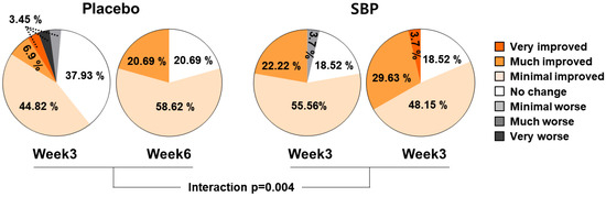 As a result of evaluating the effect of the test food on PGIC, the subjects who were evaluated as having improved after 3 and 6 weeks of intake were 55.18% and 79.31% in the placebo group and 77.78% and 81.48% in the SBP group, respectively. The PGIC significantly improved depending on the duration of test food intake (interaction p = 0.004), confirming that SBP was effective for alleviating allergic rhinitis symptoms (Figure 7).
