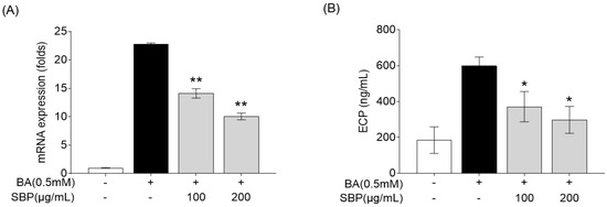 Effects of SBP extracts on ECP in the differentiation of EoL-1 cells. EOL-1 cells were induced to differentiate by adding BA for 2 days, followed by treatment with butyrate and SBP for 24 h. Subsequently, the cells or culture supernatants were used to measure (A) the relative mRNA expression level determined by qPCR and (B) the production as determined by ELISA. Data are expressed as mean ± SD. p-value compared to the BA-only-treated group according to Student’s t-test (* p < 0.05, ** p < 0.01). SBP, sword bean pod; BA, butyrate.