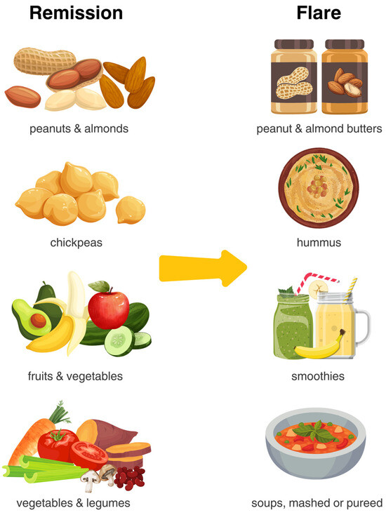 Visual comparison of dietary choices during remission versus active disease. This comparison highlights the practical implications tailored to different phases of IBD. During remission, patients can focus on nutrient-dense, whole foods such as nuts, legumes, fruits, and vegetables, consumed as tolerated. These choices support gut health, reduce inflammation, and promote overall well-being. During active disease, to ease digestion and minimize discomfort, the texture of foods can be modified—such as opting for cooked, peeled, or blended versions of fruits and vegetables and avoiding high-fiber, hard-to-digest items like nuts or raw legumes (Visual created by Leah D. D’Aloisio).
