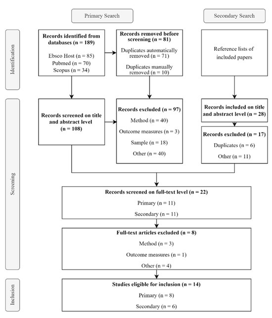 The systematic review was conducted according to the Preferred Reporting Items for Systematic Reviews and Meta-Analyses (PRISMA) criteria [40]. A completed PRISMA checklist can be found in the Supplementary Materials (Table S1). The systematic search for the relevant literature was performed in the databases Ebsco Host (MedLine Ultimate, APA PsycArticles, APA PsycInfo, Psychology and Behavioral Sciences Collection), PubMed, Scopus, and Google Scholar.