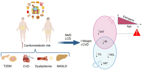 Unhealthy lifestyle behaviors contribute to weight gain in both sexes, with a predominantly subcutaneous localization in women and visceral localization in men. Overweightness/obesity increase the cardiometabolic risk through the development of type 2 diabetes, arterial hypertension, dyslipidemia, and hepatic steatosis. Mediterranean and the low-carbohydrate diets are highly recommended to reduce weight and improve metabolic derangement and cardiovascular risk. However, the physiological decrease in estrogens levels later in life predisposes women to a metabolic perturbation that may increase the risk of cardiometabolic events again. Abbreviations: CVD, cardiovascular disease; HDL, high density lipoprotein cholesterol; IR, insulin resistance; LCD, low-carbohydrate diet; MASLD, metabolic-dysfunction associated steatotic liver disease; MeD, Mediterranean diet; SAT, subcutaneous adipose tissue; T2DM, type 2 diabetes mellitus; TG, triglycerides; VAT, visceral adipose tissue.