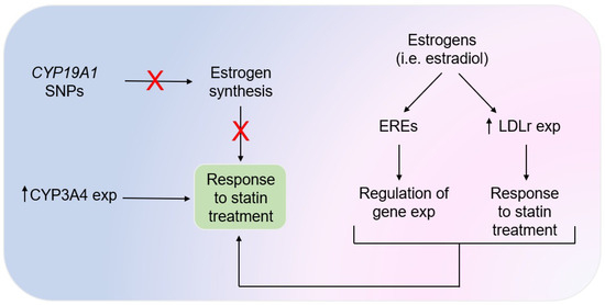 Interplay between sex hormones, lipid lowering drugs, and therapy response. Estrogens exert a protective effect on lipid metabolism in both men and women, but the latter group shows a better response to the statin treatment due to the favorable interaction between sexually dimorphic genes and drugs metabolism as well as the direct interaction between estrogens and sexually dimorphic genes. Abbreviations: CYP19A1, CYP19A1-cytochrome P450 family 19 subfamily A member 1 gene; CYP3A4, cytochrome P450 3A4 gene; EREs, estrogen response elements; exp, expression; LDLr, low-density lipoprotein receptor; SNPs, single nucleotide polymorphisms.