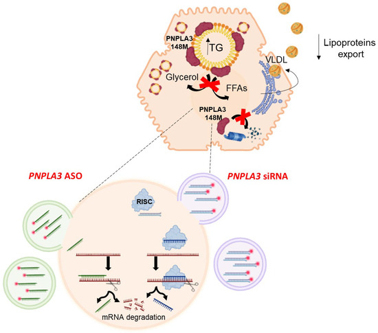 The mutant 148 Isoleucine to Methionine (I148M) protein variant in the patatin-like phospholipase domain-containing 3 (PNPLA3) gene results in a loss of function of the protein determining triglyceride retention in the hepatocytes, thus resulting in hepatic steatosis. The mutated protein is also resistant to ubiquitylation and accumulates in lipid droplets. Oligonucleotide-based therapies, such as small-interfering RNA and antisense oligonucleotide, have been developed in recent years for the treatment of MASLD by reducing the expression of the PNPLA3 gene carrying the genetic variant. Abbreviations. ASO, antisense oligonucleotide; FFAs, free fatty acids; PNPLA3, patatin-like phospholipase containing domain 3; siRNA, small-interfering RNA; TG, triglycerides; VLDL, very low-density lipoproteins; RISC, RNA-induced silencing complex.