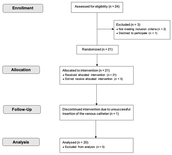 Twenty-one participants were initially included in this study. However, one participant dropped out due to unsuccessful venous catheter insertion on two separate days. As a result, complete data sets were obtained from 20 participants (10 women, 10 men; mean ± SD (range); age: 27.5 ± 7.8 (21–54) years; BMI: 23.0 ± 1.4 (19.9–24.7) kg/m2) and used for the final analysis (Figure 2).
