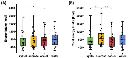 (A) Energy intake (ad libitum test meal) and (B) total energy intake (preload + ad libitum test meal) in response to oral preloads containing 33.5 g xylitol, 33.5 g sucrose, 0.1675 g ace-K, or water. Data are expressed as median and interquartile range with individual values. Statistical tests: linear mixed models followed by planned contrast analysis with Tukey correction for multiple testing. Ace-K, acesulfame potassium. Significance: ^ pTukey < 0.1; * pTukey < 0.05; ** pTukey < 0.01. N = 20.