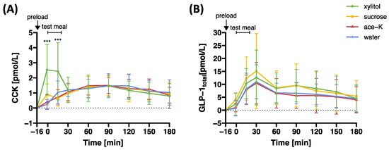 Plasma (A) CCK and (B) GLP-1total concentrations in response to oral preloads containing 33.5 g xylitol, 33.5 g sucrose, 0.1675 g ace-K, or water. Data are expressed as mean ± SD and differences to baseline values are reported. Statistical tests: linear mixed models followed by planned contrast analysis with Holm correction for multiple testing. Ace-K, acesulfame potassium; CCK, cholecystokinin; GLP-1, glucagon-like peptide-1. Significance: *** pHolm < 0.001. N = 20.