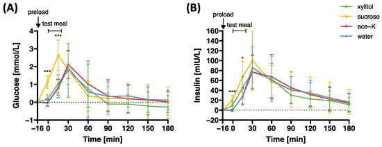 Plasma (A) glucose and (B) insulin concentrations in response to oral preloads containing 33.5 g xylitol, 33.5 g sucrose, 0.1675 g ace-K, or water. Data are expressed as mean ± SD and differences to baseline values are reported. Statistical tests: linear mixed models followed by planned contrast analysis with Holm correction for multiple testing. Ace-K, acesulfame potassium. Significance: * pHolm < 0.05; *** pHolm < 0.001. N = 20.