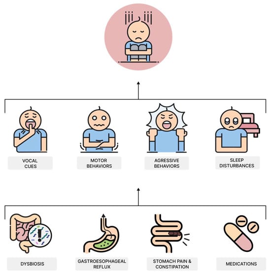 Children with autism spectrum disorder (ASD) often experience gastrointestinal (GI) symptoms, which are communicated through non-verbal cues due to their difficulty in expressing discomfort. These cues can be categorized into vocal behaviors (e.g., throat clearing, moaning, sobbing), motor behaviors (e.g., abdominal pressing, pointing, self-injury), aggressive behaviors (e.g., irritability, tantrums), and sleep disturbances (e.g., difficulty falling or staying asleep) [83,84]. Common causes include dysbiosis, gastroesophageal reflux, stomach pain, constipation, and medication side effects [72,82,86]. Early identification of these behaviors is crucial for timely intervention, improving the child’s overall well-being.