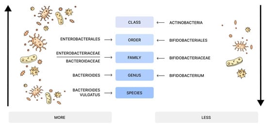 Despite the topic’s importance, research remains limited, with just one study by Ye et al. addressing the topic of ARFID and its impact on the gut microbiota [36]. Their study included 102 children with ARFID and 33 healthy children (HC). The researchers analyzed stool samples using 16S rDNA and metagenomic sequencing. 16S rDNA sequencing targets the conserved 16S ribosomal RNA gene to enable bacterial taxonomic classification based on hypervariable regions. Shotgun metagenomic sequencing sequences all microbial DNA present in a sample without target amplification [104]. While 16S rDNA sequencing allows for bacteria identification only to the genus level, metagenome sequencing allows for more precise information, such as information at the species level. Ye and colleagues found that the richness of microbial species (Chao1 index) was greater in healthy children, while the diversity of microbial species (Shannon index and Simpson index) was higher in the ARFID group. The microbial composition differed between groups, with the HC group characterized by enrichment of Actinobacteriota and its hierarchical taxa (class Actinobacteria, order Bifidobacteriales, family Bifidobacteriaceae, and genus Bifidobacterium). Conversely, the ARFID group showed elevated levels of both Enterobacterales (including family Enterobacteriaceae) and Bacteroidaceae (including genus Bacteroides and species B. vulgatus) [36] (Figure 4).