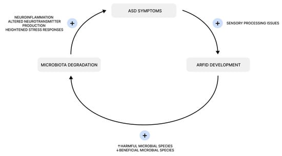 When considering all the aspects mentioned above, a compelling pattern emerges. Research shows that individuals with ASD experience FS and ARFID significantly more often than the NT population. Their selective and limited diet reduces gut microbiota diversity [123,124]. Furthermore, an imbalanced gut microbial flora can intensify autistic behaviors. This creates a cycle—ASD symptoms can contribute to the development of ARFID, which leads to microbiota degradation, further exacerbating ASD symptoms and creating a self-reinforcing loop. (Figure 5).
