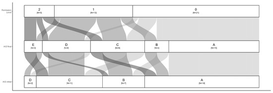 The data highlight that a significant portion of patients initially classified as AIS A or B remained in lower remission categories (AIS+0), whereas patients with initial AIS C or D showed a higher likelihood of progressing to higher remission levels (AIS+1 or AIS+2). This suggests that baseline severity relates to recovery potential. The flow between AIS initial and AIS final demonstrates the variability in natural recovery trajectories. Notably, the highest remission levels (AIS+2) predominantly occurred in patients with less severe initial injuries (AIS C or D) (Figure 2).