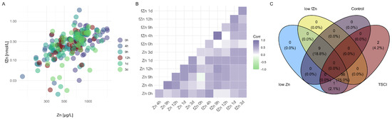 Correlation Analysis of Zn and fZn in TSCI and control groups over time. (Panel (A)) features a scatterplot of total Zn versus fZn concentrations, color-coded by days post-injury to illustrate temporal changes and correlation patterns within the TSCI and control cohorts. (Panel (B)) presents a correlation heatmap (corrplot) showing the strength and direction of the relationship between total Zn and fZn across all time points. (Panel (C)) includes a Venn diagram comparing groups with low Zn and low fZn levels among individuals with TSCI and controls, highlighting the overlap and distinct subsets within these categories. This comprehensive visualization aids in understanding the dynamics and potential diagnostic relevance of Zn and fZn in traumatic spinal cord injury.